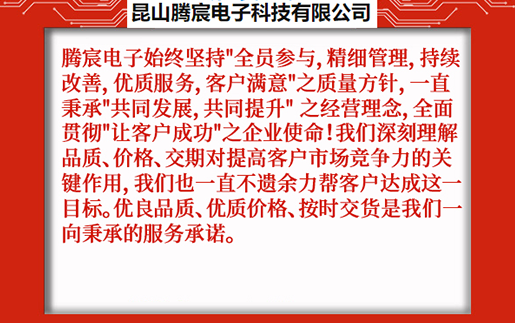 昆山騰宸電子科技有限公司位于中國線路板加工之都昆山千燈,公司專注于電路板研發(fā)設(shè)計、PCB抄板、元器件采購、SMT貼片加工、組裝測試,為客戶提供一站式電子制造服務。騰宸電子始終堅持"全員參與,精細管理,持續(xù)改善,優(yōu)質(zhì)服務,客戶滿意"之質(zhì)量方針,一直秉承"共同發(fā)展,共同提升" 之經(jīng)營理念,全面貫徹"讓客戶成功"之企業(yè)使命!我們深刻理解品質(zhì)、價格、交期對提高客戶市場競爭力的關(guān)鍵作用,我們也一直不遺余力幫客戶達成這一目標。優(yōu)良品質(zhì)、優(yōu)質(zhì)價格、按時交貨是我們一向秉承的服務承諾。 ...